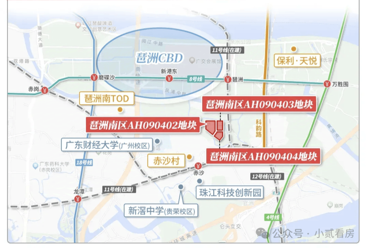三块地位于琶洲南TOD项目东侧,就隔着一个大围公园,向北跨过黄埔涌,就是琶洲中区“印钞机”广交会展馆,有公园+河涌+CBD景观,不仅地段能打,景观资源也同时在线,有做改善产品的条件。