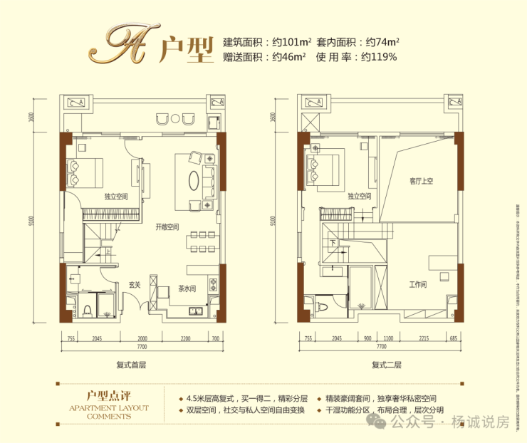 【A户型·约101㎡复式】 ✅4.5米层高|买一得二 ✅一层社交|二层私密 ✅主卧套间|豪华装修 ✅功能分区|灵活多变