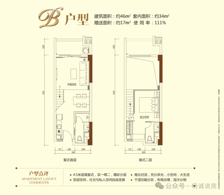 【B户型·约46㎡复式】 ✅4.5米层高|买一得二 ✅南北对流|阳光满屋 ✅一层休闲|二层休憩 ✅干湿分区|布局精巧