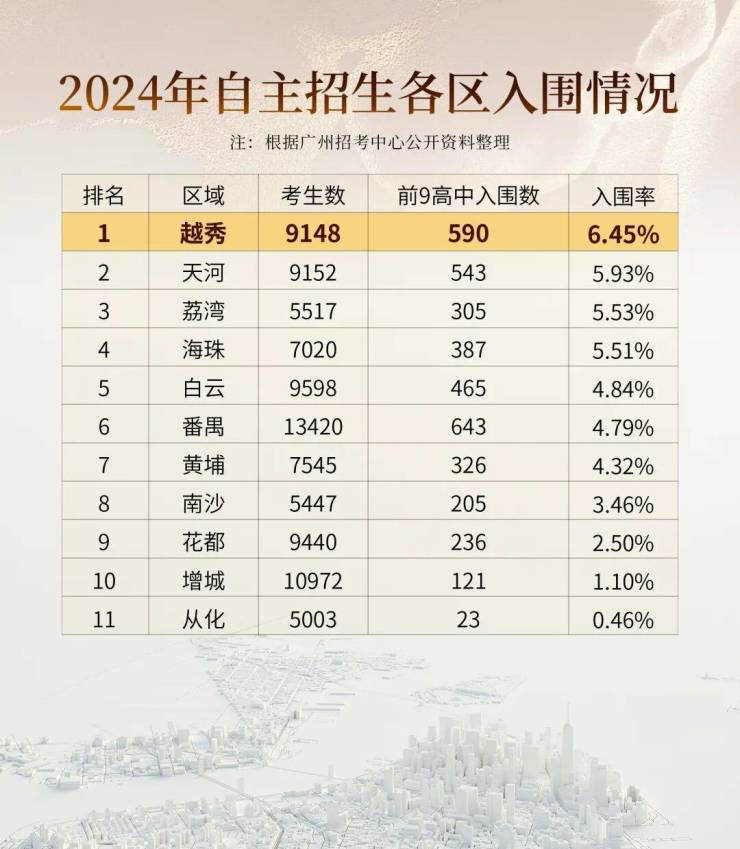 2024年高中自主招生各区入围情况是最新力证:越秀区以6.45%的入围率雄踞全市榜首(来源:广州招考中心),领先第二名天河区0.5个百分点,展现出独一档的吸引力与培养潜力。