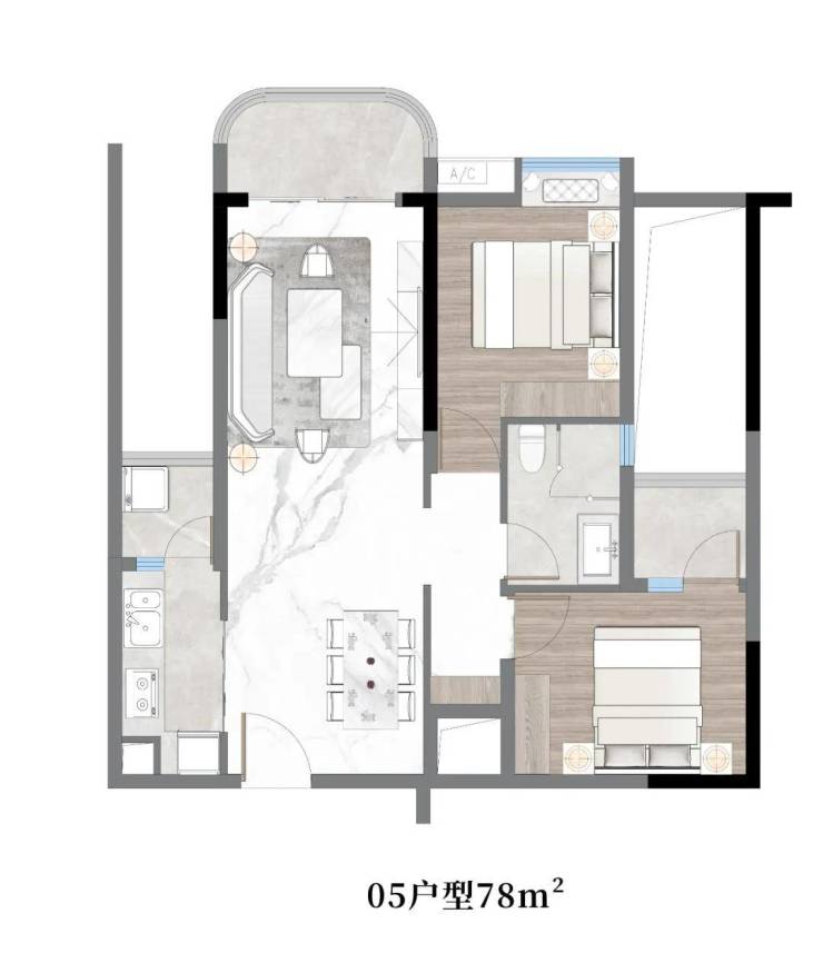 05户型:约78㎡,两房两厅一卫