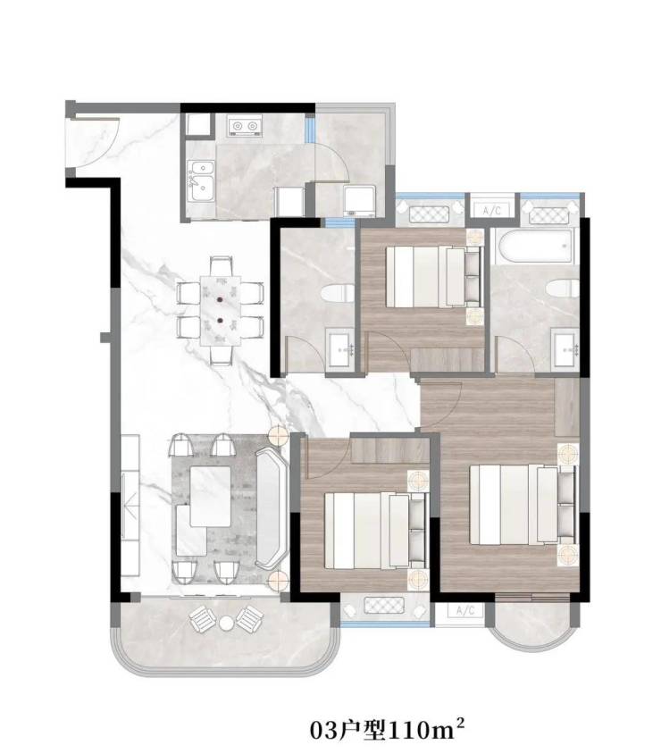 03户型:约110㎡,三房两厅两卫带主套