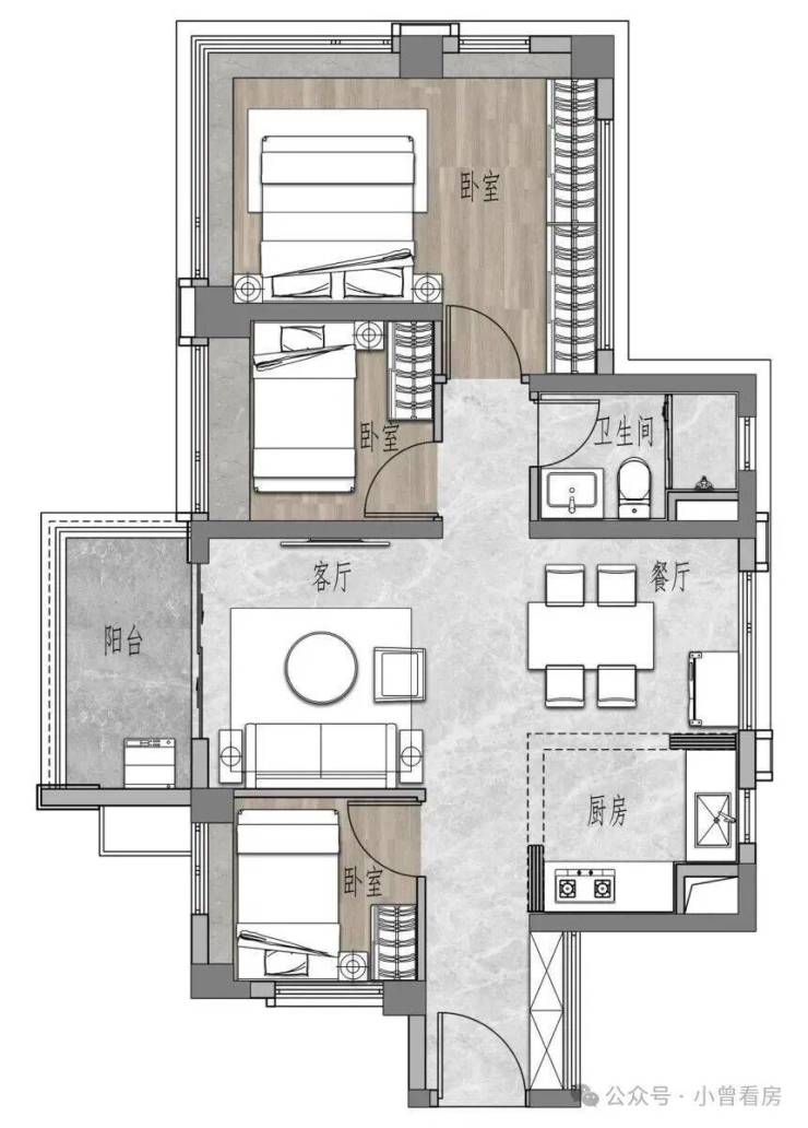 69㎡三房一卫是刚需热门款,得房率超过 100%,主卧带有三面飘窗,空间利用率很高,总价控制在合理范围,适合预算有限的年轻夫妻或三口之家。