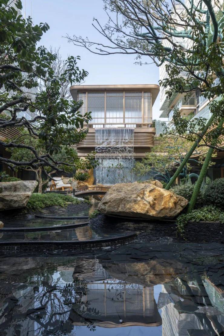 吟月池,即下沉式山水会客厅,飞瀑、叠石、流水、绿植,错落排布,水光映壁,流影藏真。