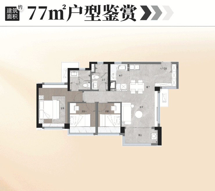 约77平户型室内更采用“少承重墙”设计,屋内大部分空间都能灵活调整,适应家庭不同阶段的需求。
