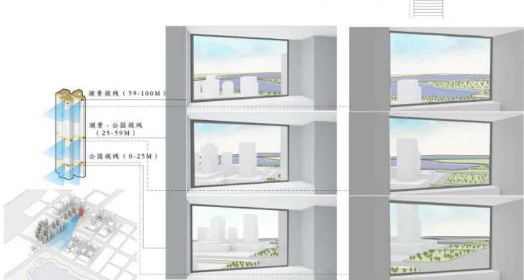 为了满足采光、通风和湖居视野的平衡,项目楼栋整体采用北高南低分布,并将楼栋偏转了38°,协调阳光与湖景的比例。
