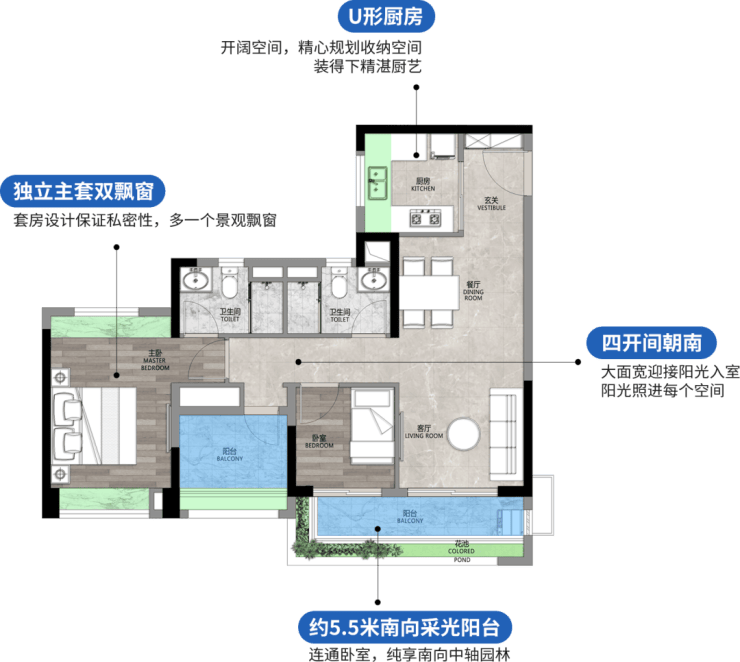 78㎡三房两厅两卫,全新升级三房,四开间朝南,超11米南向采光面,270度超大角度采光,直望广阔园景。