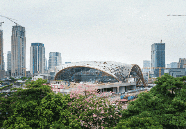 外立面采用木色陶板与全景玻璃幕墙,以“曲水流觞”的涟漪造型呼应珠江文脉,同时融入垂直生态理念,打造空中绿岛与可呼吸的建筑肌理。
