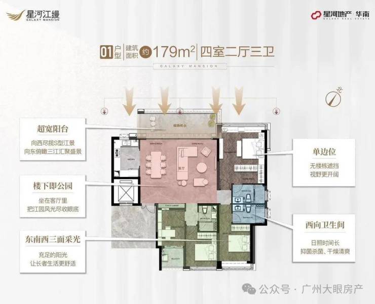 1、2、3栋的面积段均为179㎡,4栋的211㎡,4栋是星河江缦总层最高的一栋,30层高,南北都能望江,白天鹅楼栋也能映入眼帘,其中5层以上是住宅区,1-4层为业主会所,诸如健身房、高尔夫球练习室、茶室、共享厨房等功能区。