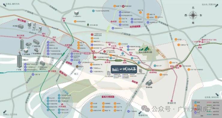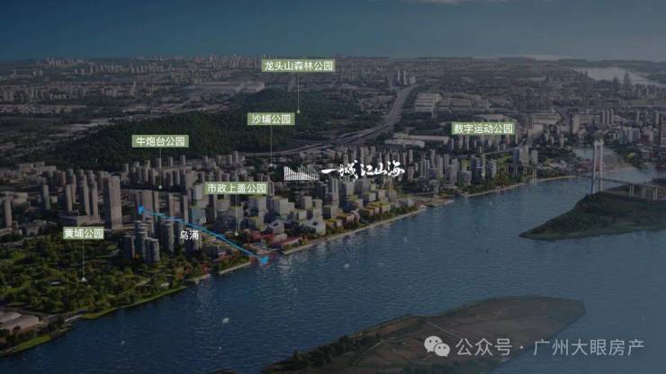 拥揽珠江一线景观、关键还是南向望江,这是连琶洲都做不到,还背靠5000亩龙头山森林公园,南望珠江水,山水相依,所开发地块约90%界面朝向公园,打造 300 米见绿,500 米见园;加上片区规划“5+9”的“公园城市”,一流生态环境实现出门即入园