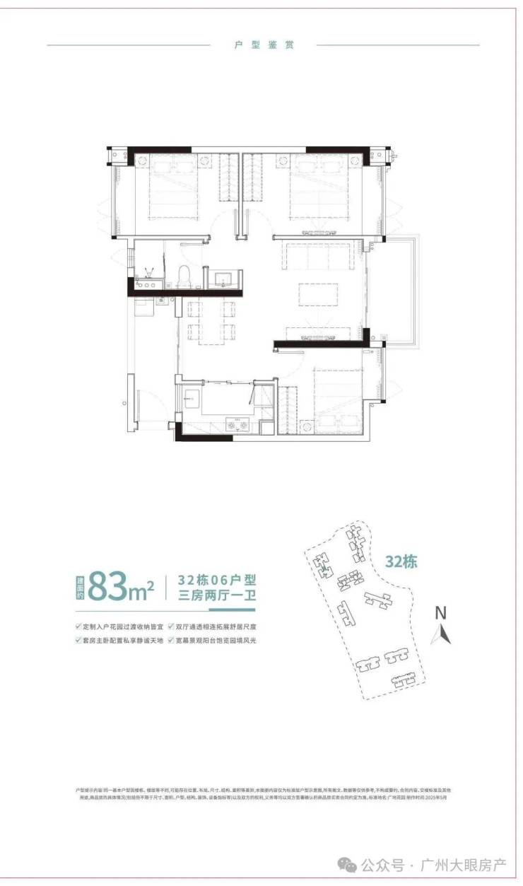此次广地花园·观灏加推的新品32栋悦景楼座,面积段分别为86m²、96m²、100m²悦景三房,多面采景,三面望水,通透采光,充分利用户型的每一寸肌理,以有限的生活空间焕发更多生活灵感,打造全方位人性化居所。