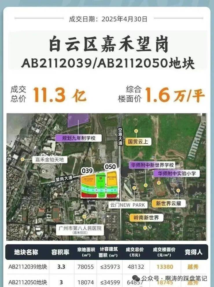 2025年4月30日,越秀地产在土拍市场杀出重围,拿下了嘉禾望岗两个地块。AB2112050地块,AB2112039地块,折合楼面价分别为1.87万/㎡和1.34万/㎡。