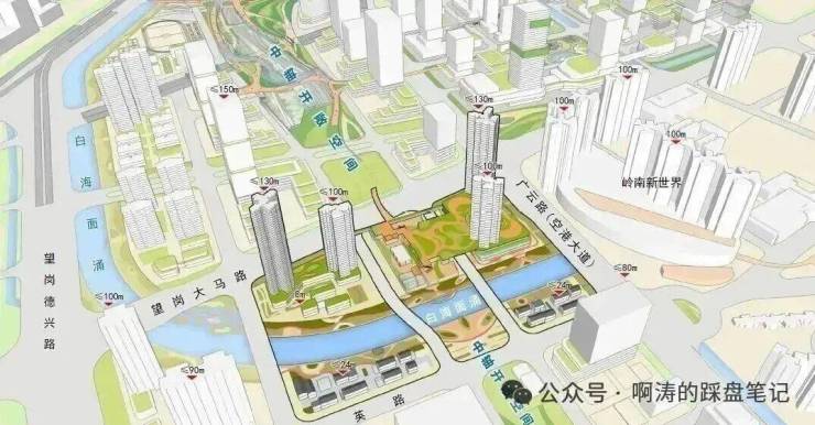 ◇将采用“水岸共生”理念,以白海面涌为生态主轴,构建滨水慢行廊道。同时沿嘉禾望岗上盖设施打造景观化中轴公园,塑造片区创意活力。