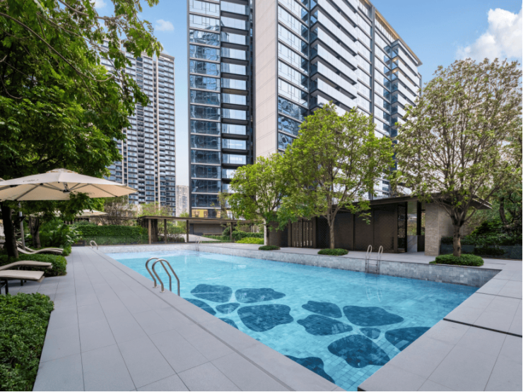 藏于林涧的泳池泛会所,以自然森林氛围打造,让使用者尽享放松时光。树林成为城市喧嚣的天然屏障,微风拂过,树叶沙沙,为炎热夏季带来清凉遮荫。夜幕降临时,泳池廊架景墙上的名贵奢石便流转出璀璨光华,与沉稳的海浪灰石材墙面共同勾勒出艺术的剪影,而池底那片温润的暹罗白石材,则默默承托着每一份闲适与优雅,营造出浓郁的度假氛围。