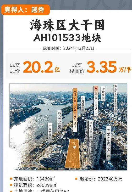 调整完后,在2024年12月23号进行拍卖,最终被越秀地产以20.23亿元拿下,楼面价为33501元/㎡。