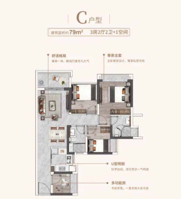 79㎡ | 4房·2厅·2卫:餐客一体设计,主卧套房提供私密空间,书房茶室功能灵活多变。
