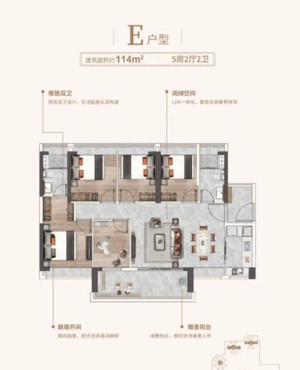 114㎡ | 5房·2厅·2卫:LDK一体化布局,四开间朝南,巨幕宽景阳台,生活起居从容有度。
