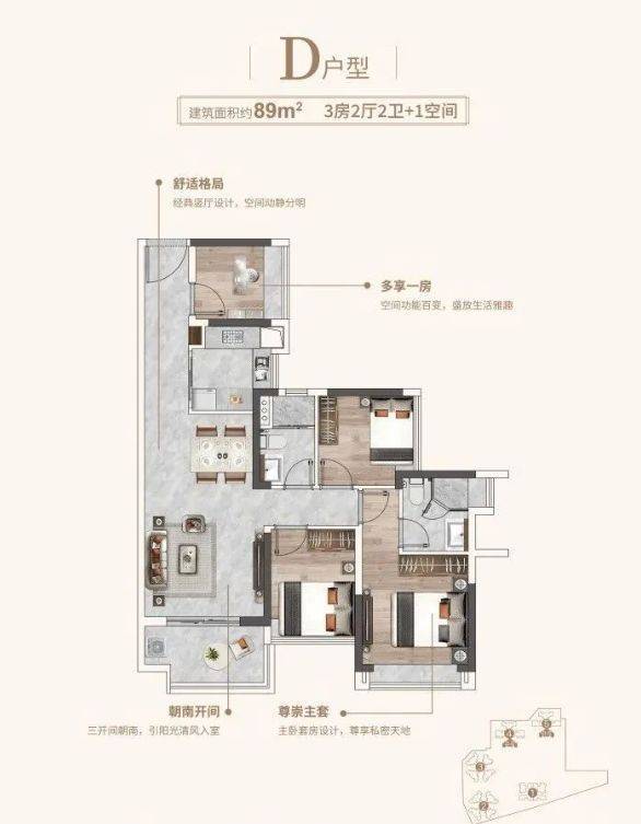 89㎡ | 4房·2厅·2卫:经典竖厅设计,动静分区明显,三开间朝南,保证充足采光。