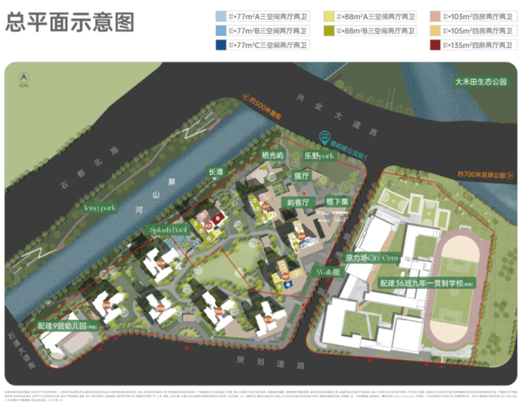 项目 074-1 地块配建 36 班九年制学校,074-2 地块配建 9 班幼儿园,周边还有广州博萃德学校,涵盖了从幼儿教育到九年义务教育以及国际教育等不同类型的教育资源。