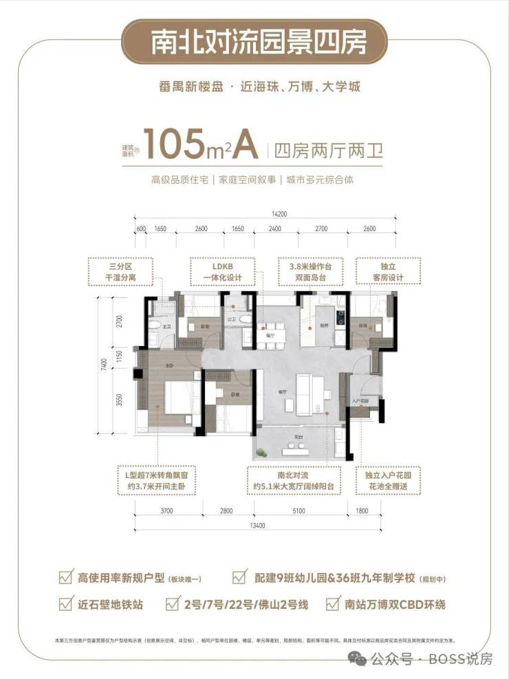 105㎡户型:南北对流大方厅,客厅面积可扩至23㎡,三代同堂无忧