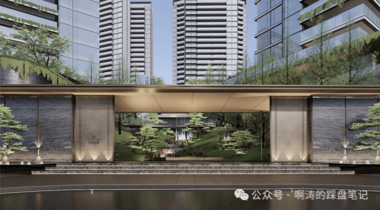 小区门庭落成15米落差瀑布,五棵悬崖式迎客黑松作揖相应,归家仪式感满满
