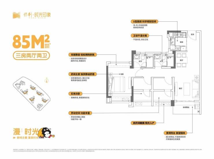 建面85㎡的户型,不仅有独立主卫给予业主更有仪式感的生活,而且还有可以有双飘窗做加持。
