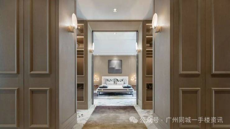 左右各有超大的步入式衣帽间,廊道上铺设星光红毯,走到尽头才是睡眠区。