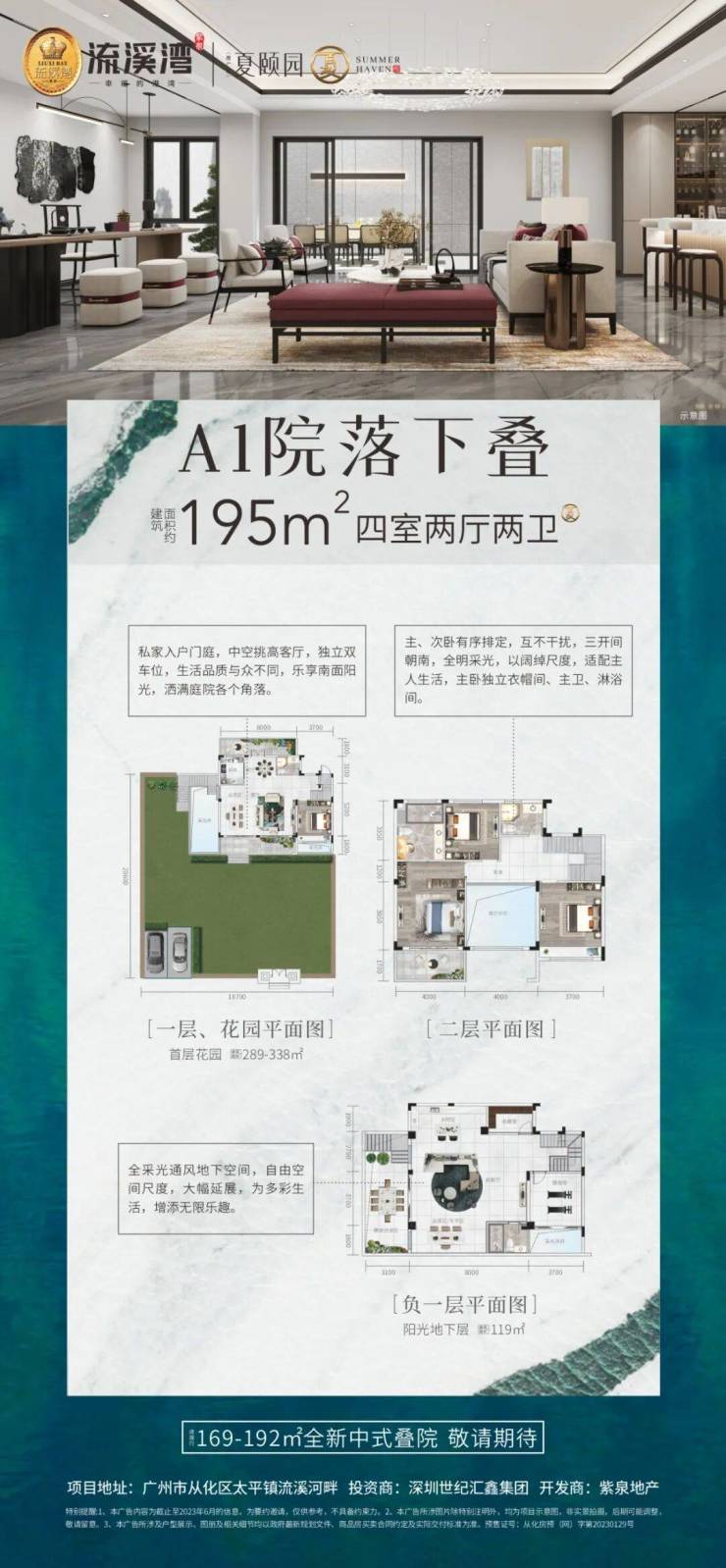 A1下叠 建筑面积约192㎡、花园约297-338㎡、地下室约119㎡