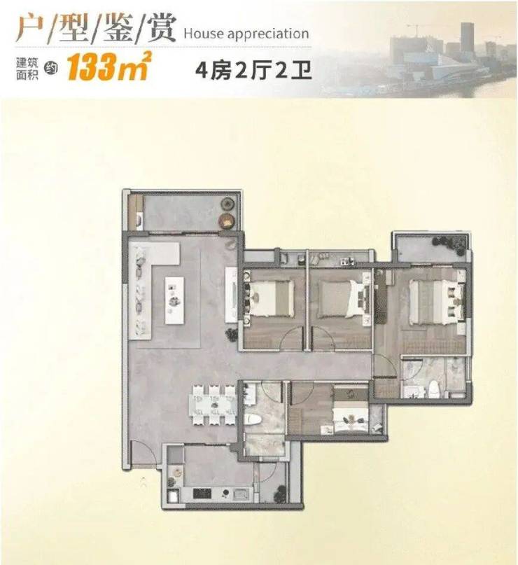 建面约133㎡天幕四房,三面单边采光,百变三阳台,既静谧亦亮堂,让三代同堂的温馨互动,自带诗意滤镜。