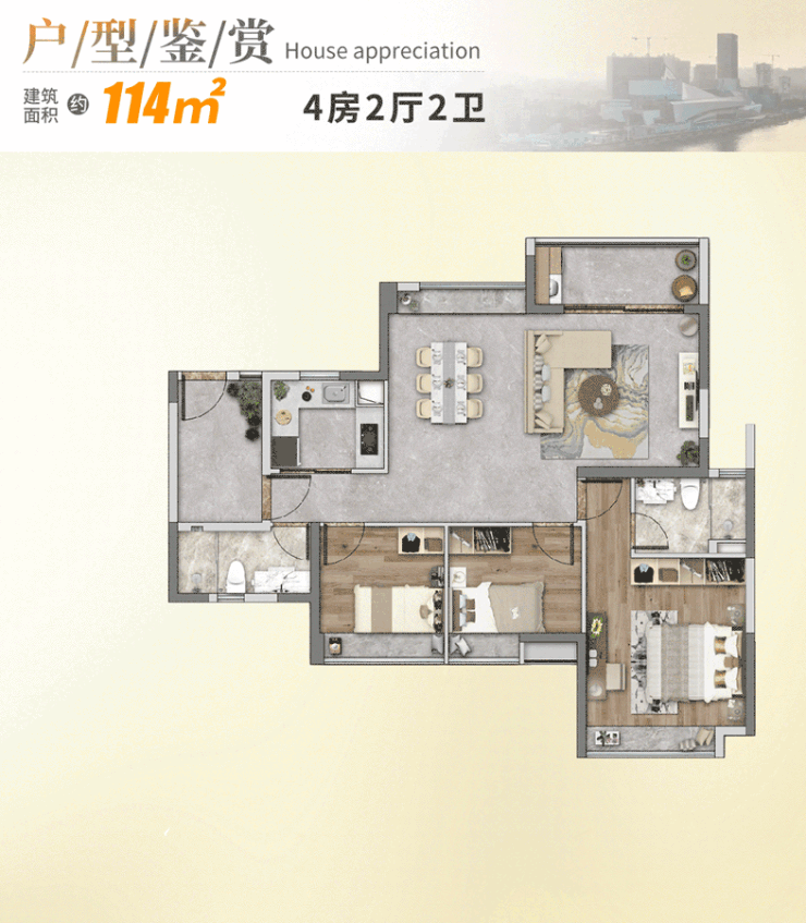 建面约114㎡奢居四房,南北通透,全飘窗设计,暖阳倾泄而来,晕染出满屋暖煦。超10米宽幕采光面,由餐客厅延展至卧室,都是白鹅潭江景的最佳观赏台。若是家庭成员人数有变化,也能通过改造+1房,轻松升级为四房。