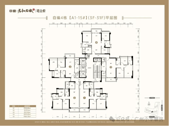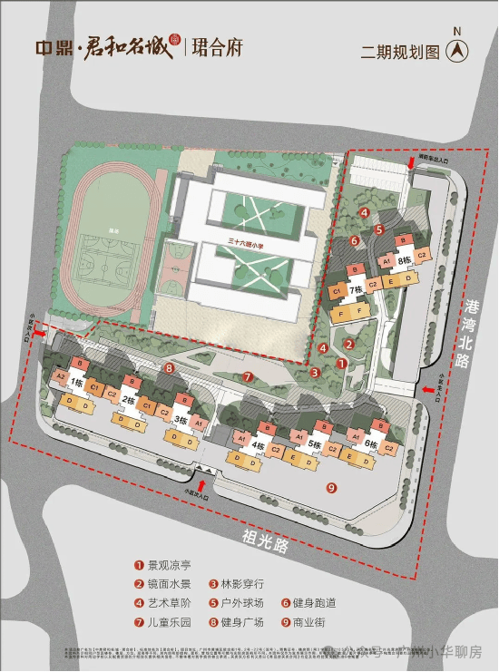 中鼎珺合府在售的二期,总共8栋楼,层高33层,均为三梯五户设计,精装现楼交付,小区整体为L型布局,前后无遮挡,采光比较好,就是花园不大。