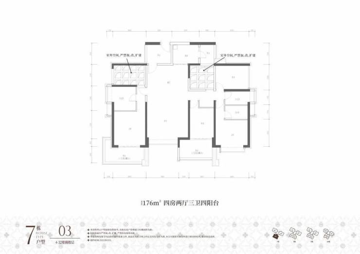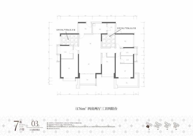 7栋03户,建面约176㎡,原始结构是四房两厅三卫四阳台,奇数层客厅、主卧、厨房都有阳台,偶数层是主卧、次卧、厨房有阳台。奇数偶数层入户门的阳台可做玄关使用,餐厅左侧镂空处搭起来可做卧室,餐厅右侧搭起来可做书房或儿童房使用,最多可做5+1房使用,可塑性非常强