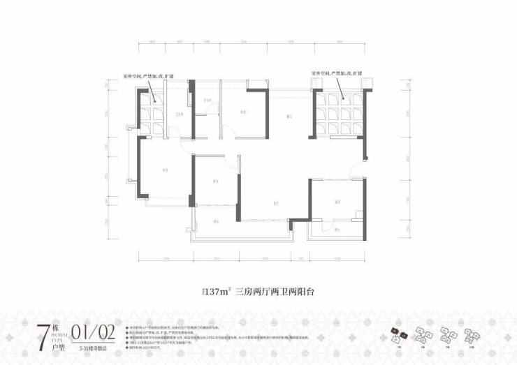 7栋01/02户,建面约137㎡,原始结构是三房两厅两卫两阳台或三阳台,奇数层客厅出阳台,厨房配有一个生活阳台,偶数层餐厅出阳台,主卧和厨房也都配有阳台。奇数偶数层入户玄关处都有一块镂空,搭起来可做房间,即使不搭它的整体户型结构、功能间配比及分布也比较合理。