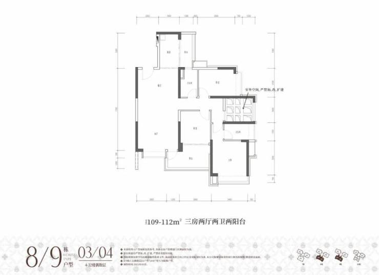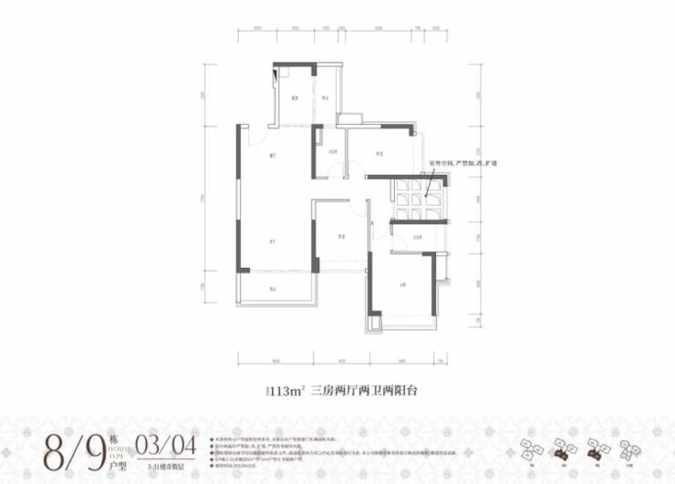 8/9栋03/04户型,建面约109-113㎡,原始结构是三房两厅两阳台,奇数层客厅正出阳台,偶数层客厅侧出阳台,奇数偶数层厨房都有生活阳台,且主卫与次卧之间有一块镂空的地方,搭板并入主卧做书房或者单独做儿童房使用都可以,不能搭的话结构也还说的过去,就是得房率会低一点。