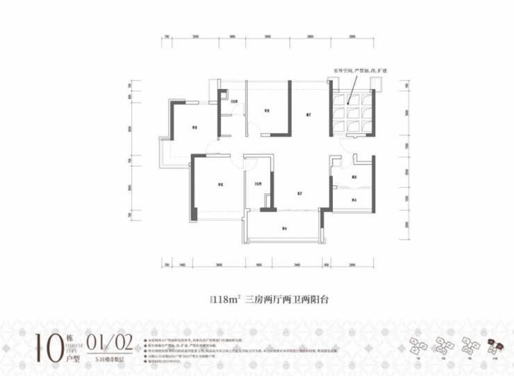 10栋01/02户型,建面约118㎡,原始结构是三房两厅两卫两阳台或三阳台,奇数层是客厅和厨房配有阳台,偶数层是餐厅、主卧和厨房都配有阳台,奇数偶数层入户玄关处都有一块镂空,搭板可以多一个卧室,不能搭的话整体户型结构、功能间配比及分布也还是合理的。