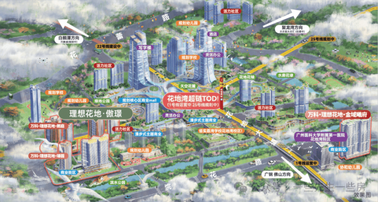 从项目步行到地铁1号线花地湾站大概3-400米,听说地下预留了通往地铁的通道,以后不怕风吹日晒雨淋,对上班族来说很舒适。(百度地图直线距离)