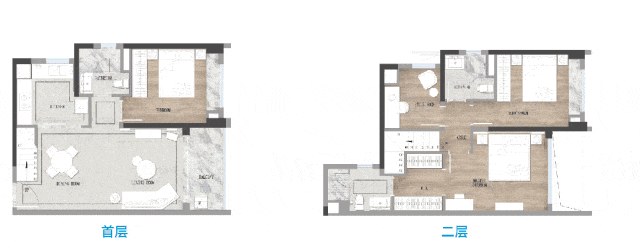 :一层设置客厅、餐厅、厨房、阳台及一间卧室和一个卫生间,二层为 3 个房间,实现动静分离,且全明无暗房,居住体验好。