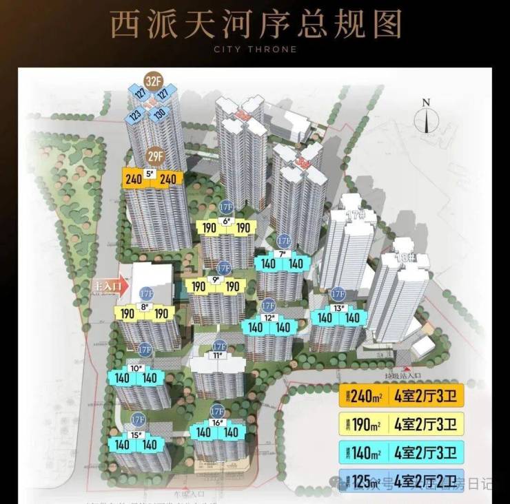 1-3号楼,120-143平,2梯4户,塔楼,层高3米,总层高32层。