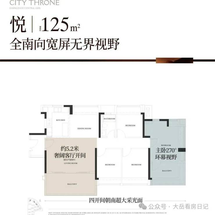 约8.4米南向巨幕阳台,主卧270°飘窗,能最大程度引园景入室。