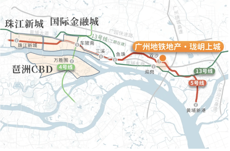 珑岄上城位于老黄埔海丝城板块,与老黄埔核心文冲站仅一站地铁之隔,位于5号线双沙地铁站上盖。老黄埔唯一真正的 TOD 项目,与地铁融合紧密,下楼即地铁,出闸即到家,有专属地下通道。