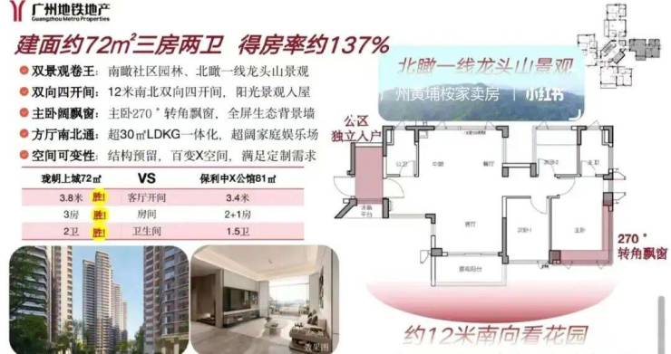 珑岄上城容积率仅 2.17,为 5 号线沿线及老黄埔最低密新盘,多为 16 - 32 层小高层、中高层,梯户比低至 2 梯 2 户,楼间距大,通风采光好,园林约 1.5 万㎡,还可眺望龙头山森林公园。