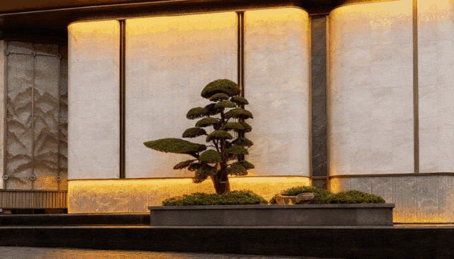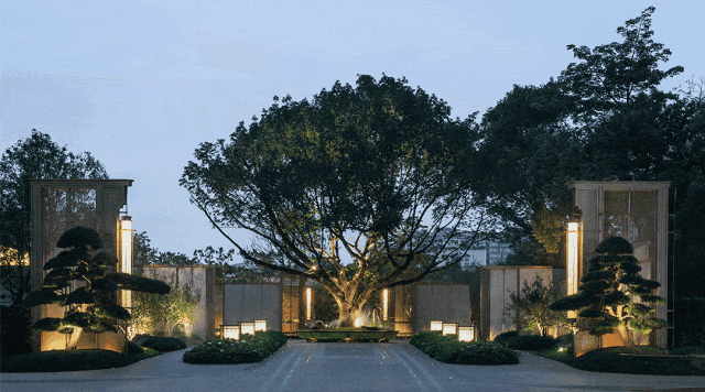 项目不惜辗转国内多家苗圃,全冠移植两棵超百万的珍稀罗汉松,带来媲美岭南四大园林的庭院古松氛围。