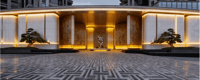 小区设计:主入口立面铺陈雅博白大理石、基座落定海洋灰花岗岩,中央景墙采用巴西安第斯雪景大理石...都是保利天曜、琶洲南TOD等顶豪御用之材。