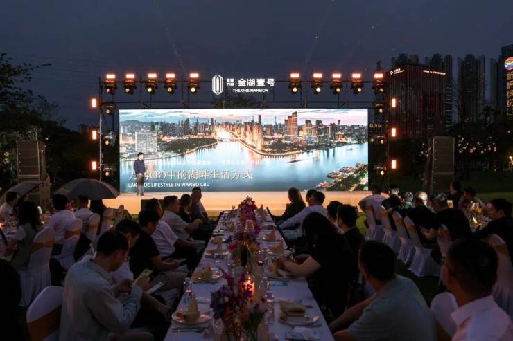 暮色初临,华灯渐起,嘉宾们陆续抵达这一湖畔胜地。会场巧妙融合自然元素与现代艺术,草坪区雅致坐席、露台开阔视野、灵动水景装饰相互映衬,共同构筑出一个沉浸式的湖居生活体验空间。