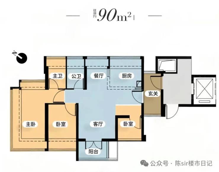 01东边位:90㎡竖厅三房,东南向