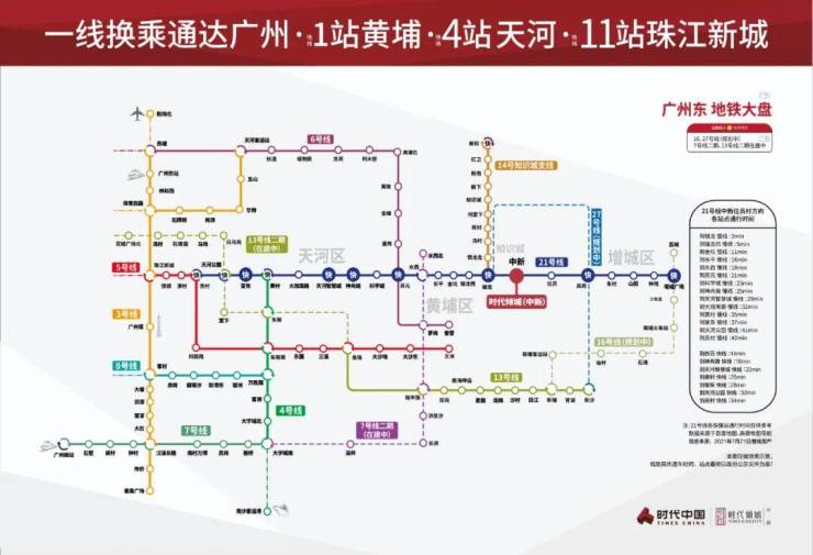 地铁21号线中新站:1站黄埔,(快线)4站天河,项目设有如约巴士接驳地铁中新站,转瞬即达地铁口,另有4条公交线路接驳地铁口,出行高效便捷。
