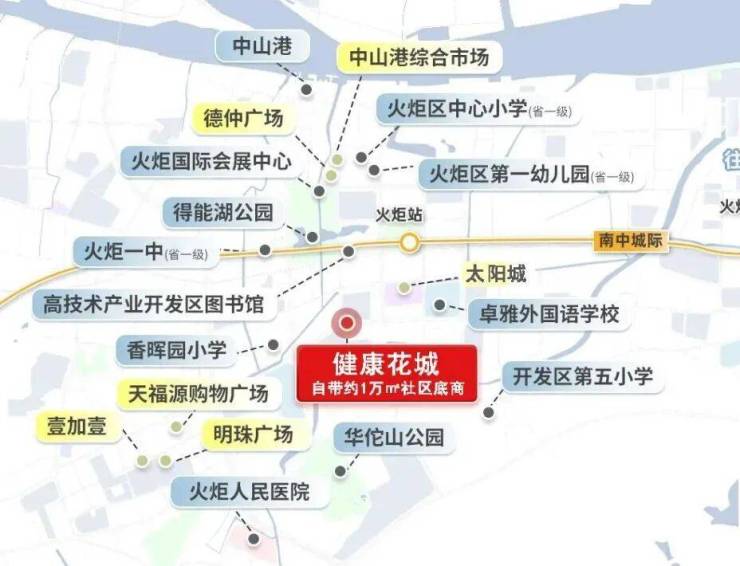 同属于火炬中心板块的健康花城璞悦,除了南中城际火炬站(在建)、太阳城广场、得能湖公园、华佗山公园等外在配套。