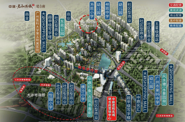 商业——自配套约40万㎡商业体;约260米书香街,私塾文物原址修缮保留,结合现代商业,打造广州版“岭南天地”;周边毗邻大沙地、文冲、三溪美林湖商圈,山姆会员店、宜家等大型商超满足时尚都会生活;