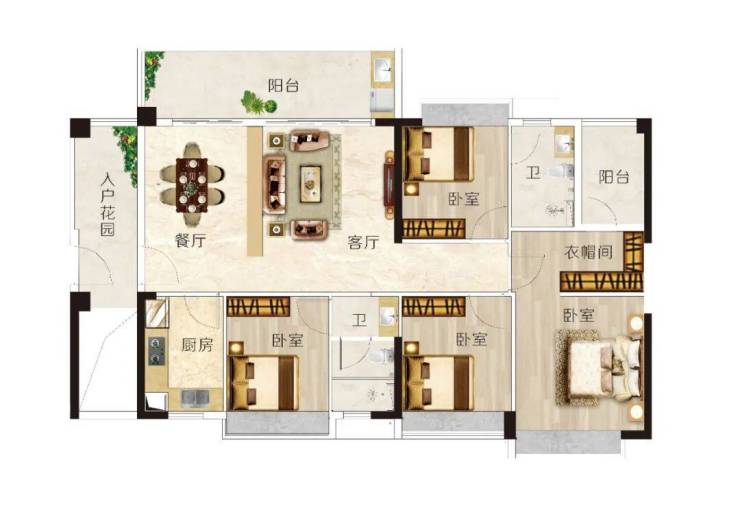 D户型 建面约137m² 4房2厅2卫◆户型方正实用,动静分区,布局合理◆超大入户花园,莳花弄草,养神养眼◆三分离卫生间,多人同时使用也从容◆主卧套房设计,尊奢衣帽间,生活精致