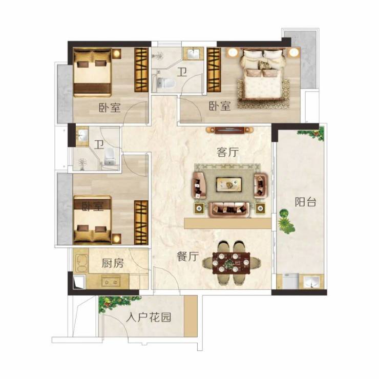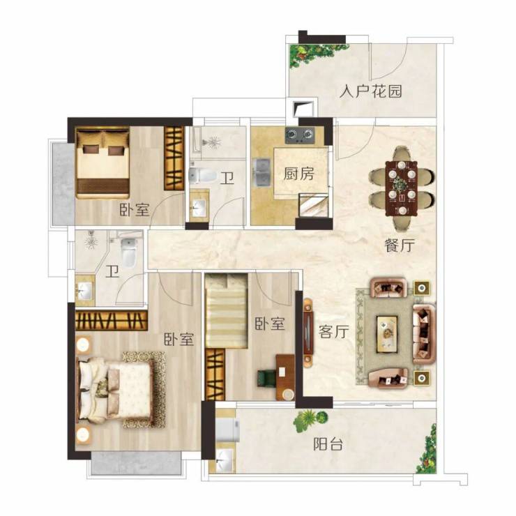 E户型 建面约106m² 3房2厅2卫◆户型方正实用,动静分区,布局科学◆阔绰双厅,宴请亲朋,尽显大家风范◆超大宽面阳台,一家人的空中大花园◆主卧带转角飘窗,视野开阔无遮挡